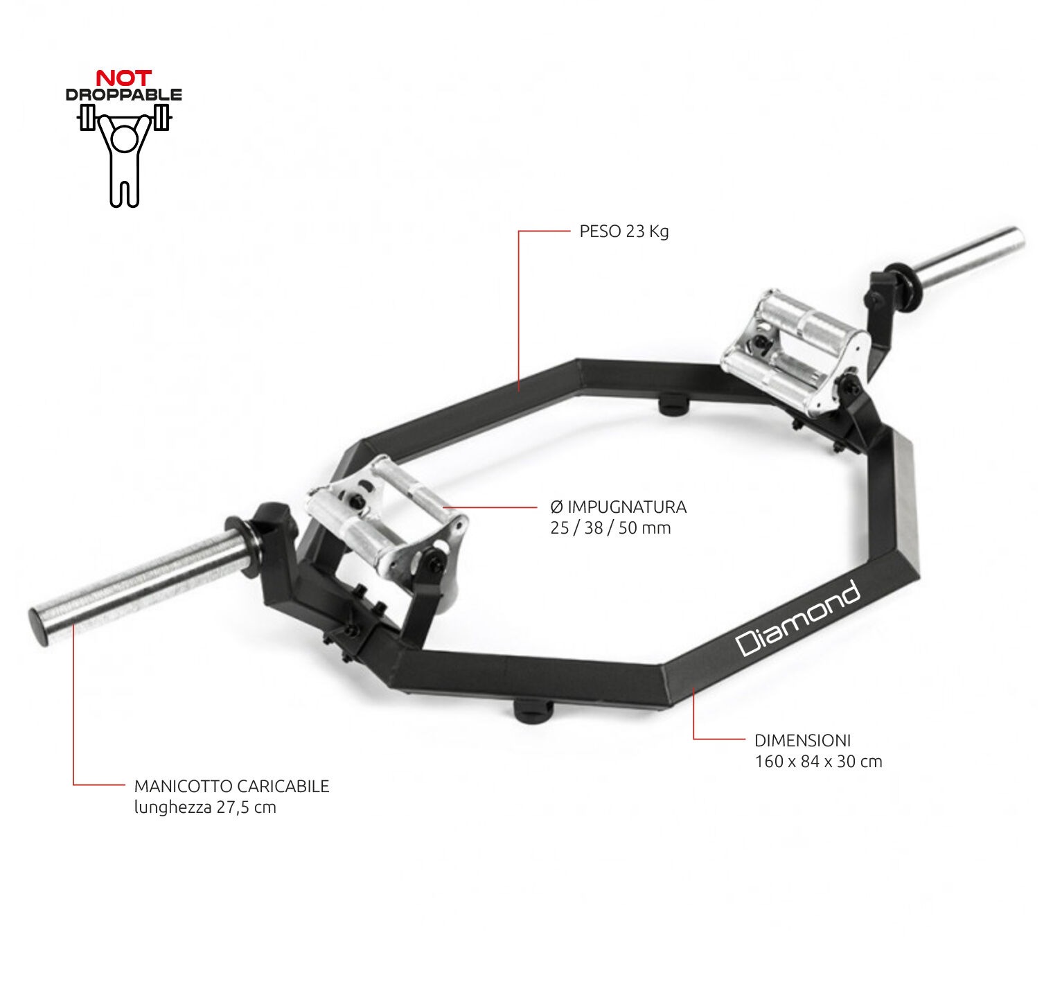 Il Bilanciere Olimpico Esagonale Diamond è ideale per deadlift e shrug, con impugnature zigrinate in 3 diametri. Realizzato in acciaio e inox, la versione PRO include manicotti in acciaio inox e piedini in gomma. Pesa 23 kg e supporta un carico massimo di 300 kg.
