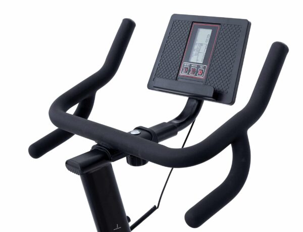 Il ciclocomputer integrato con display inclinabile mostra tempo, distanza, velocità, calorie, Watt, frequenza cardiaca e RPM. La bike è compatibile con app Kinomap e Zwift (abbonamenti esclusi) grazie al sensore integrato, e il supporto per tablet e smartphone permette di seguire contenuti digitali durante l’esercizio.